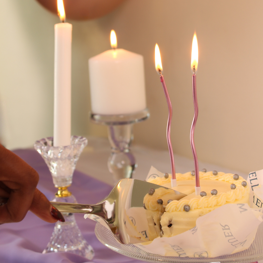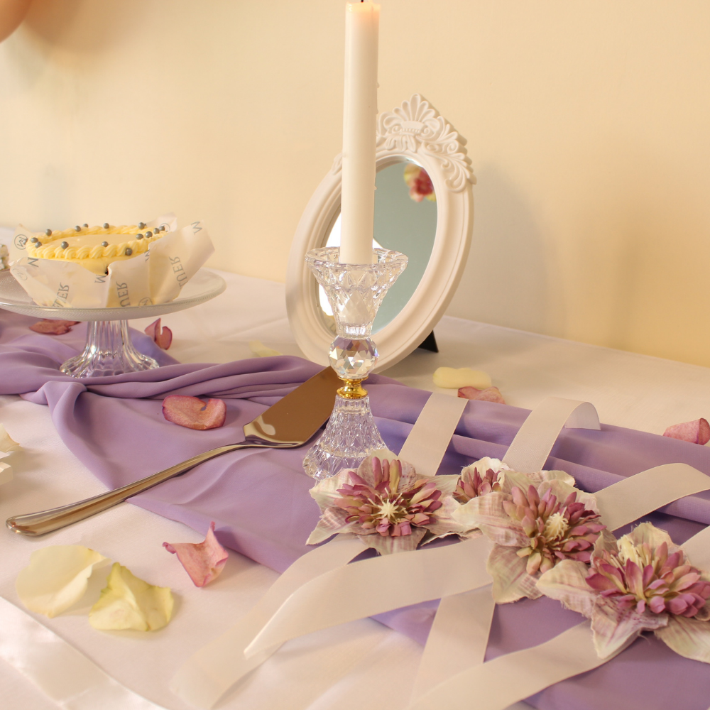 تنسيق أنثوي أنيق، شموع وأجواء دافئة، ورد بنفسجي، وبالونات هادية تعكس فخامة المناسبة.
